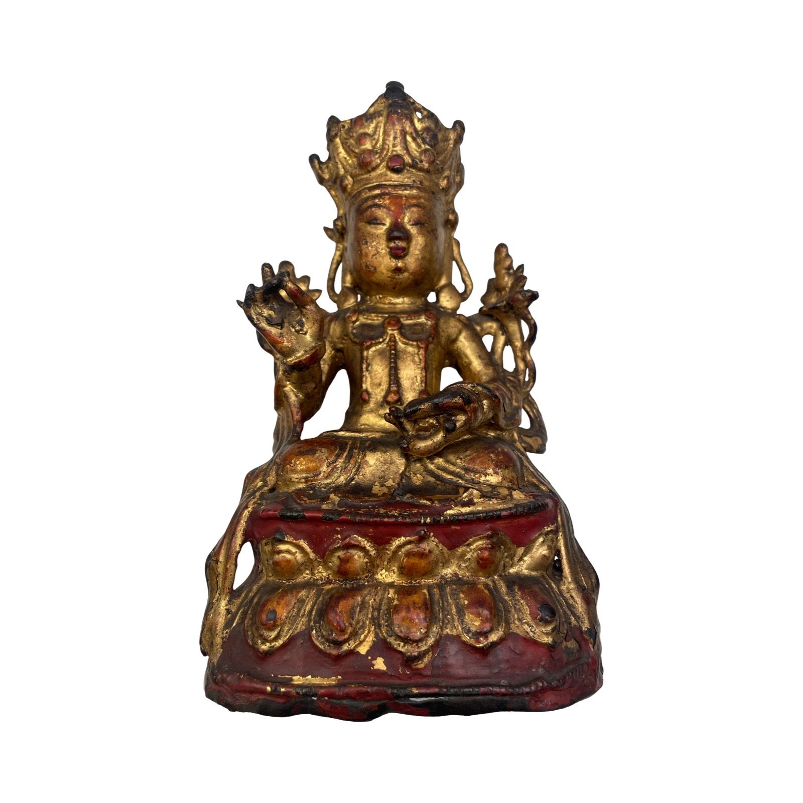 Belle statue d’Amitayus en bronze doré assis sur une double fleur de lotus. Travail sino-tibétain, attribuable au XVIIᵉ siècle.