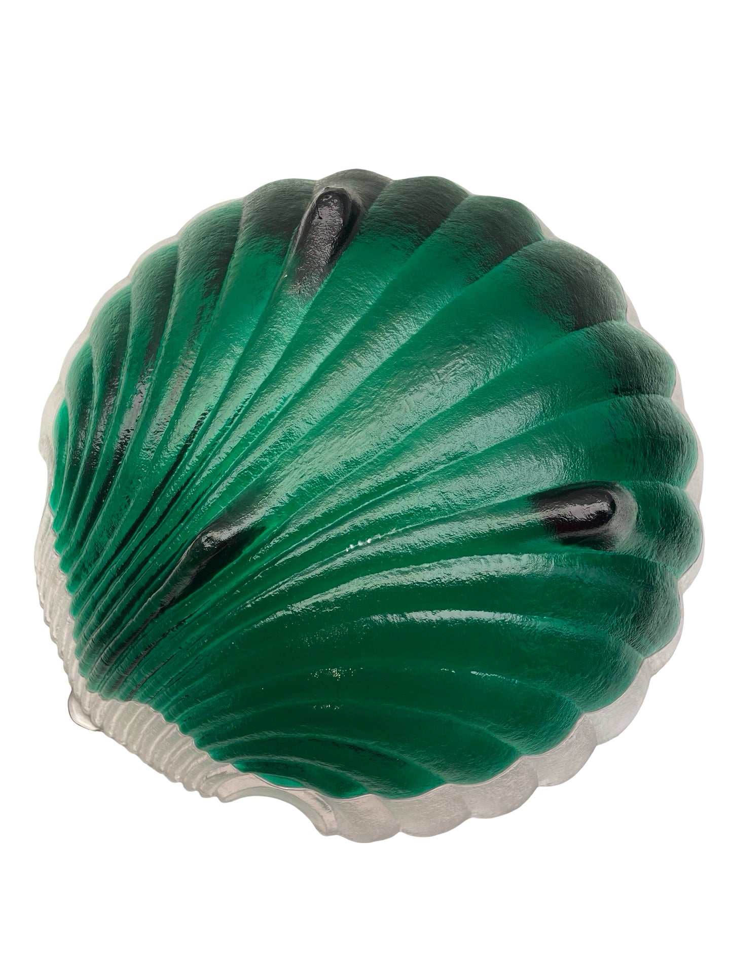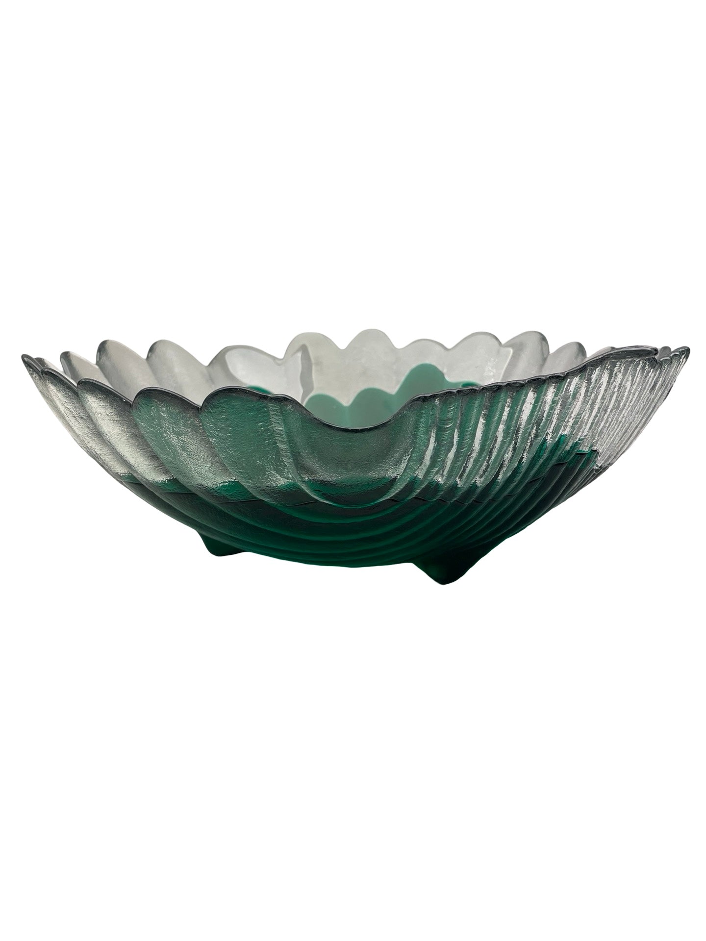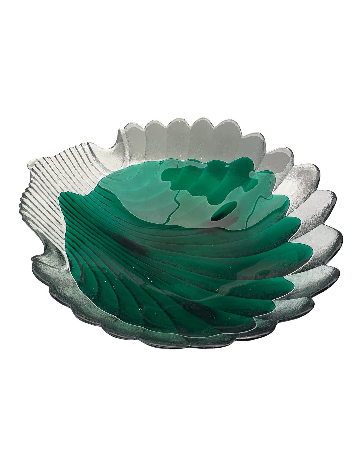 Imposante coupe décorative en verre, en forme de coquille stylisée, associant un verre incolore texturé à un verre vert bouteille profond.