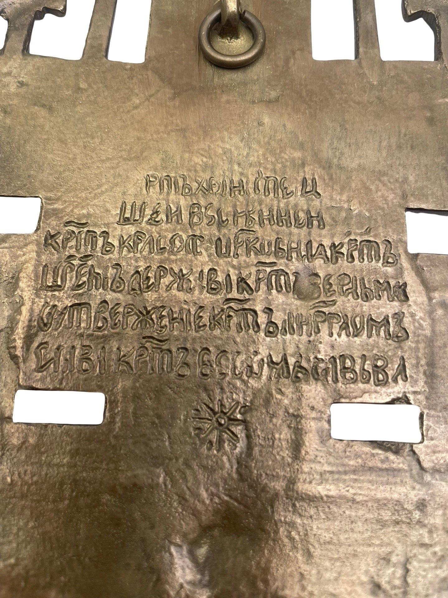 Icône orthodoxe en laiton moulé et émail polychrome, représentant la Crucifixion entourée de scènes bibliques et de figures saintes disposées en registres.