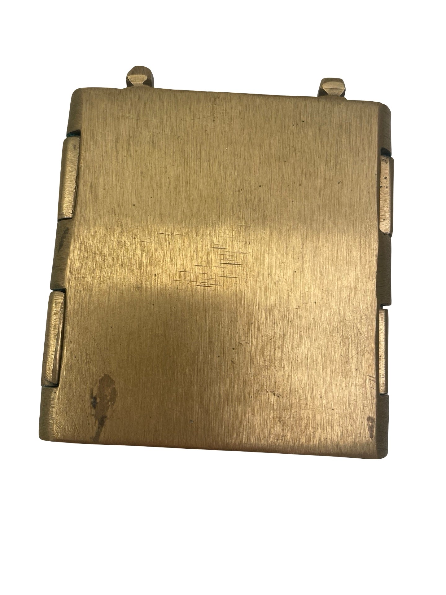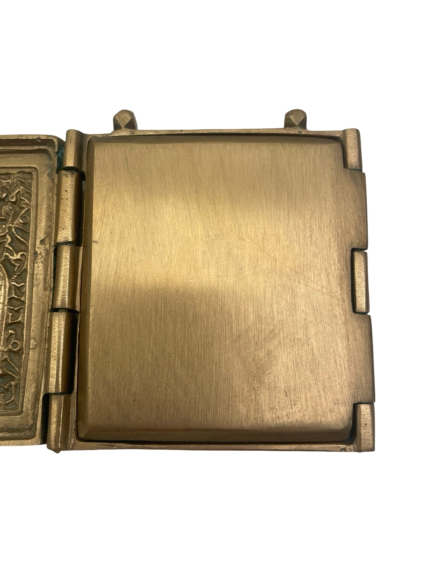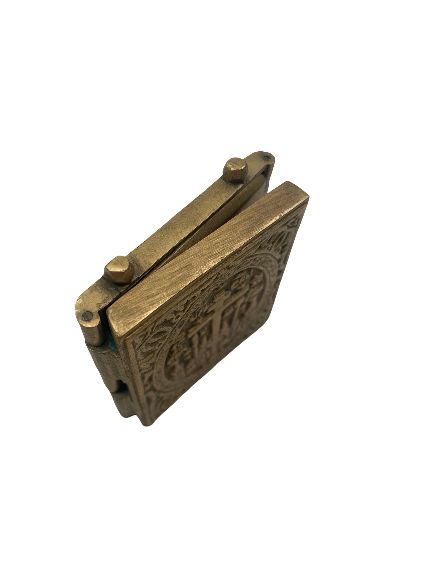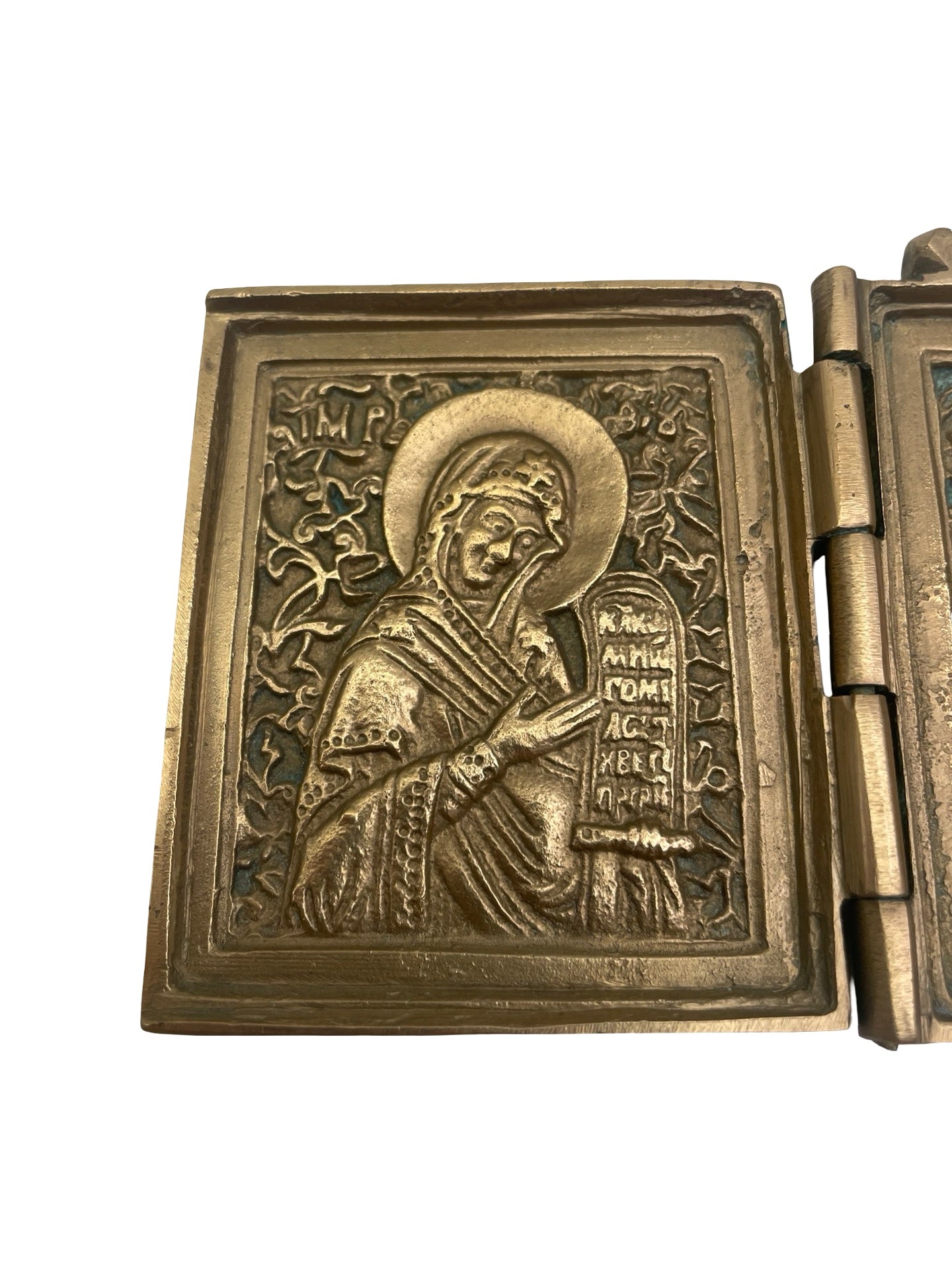 Ce type d’icône pliante, entièrement métallique, était destiné à l’usage personnel ou au transport, notamment pour la prière en déplacement. L’ensemble est réalisé sans support en bois, chaque panneau étant en laiton massif articulé par charnières d’origine.