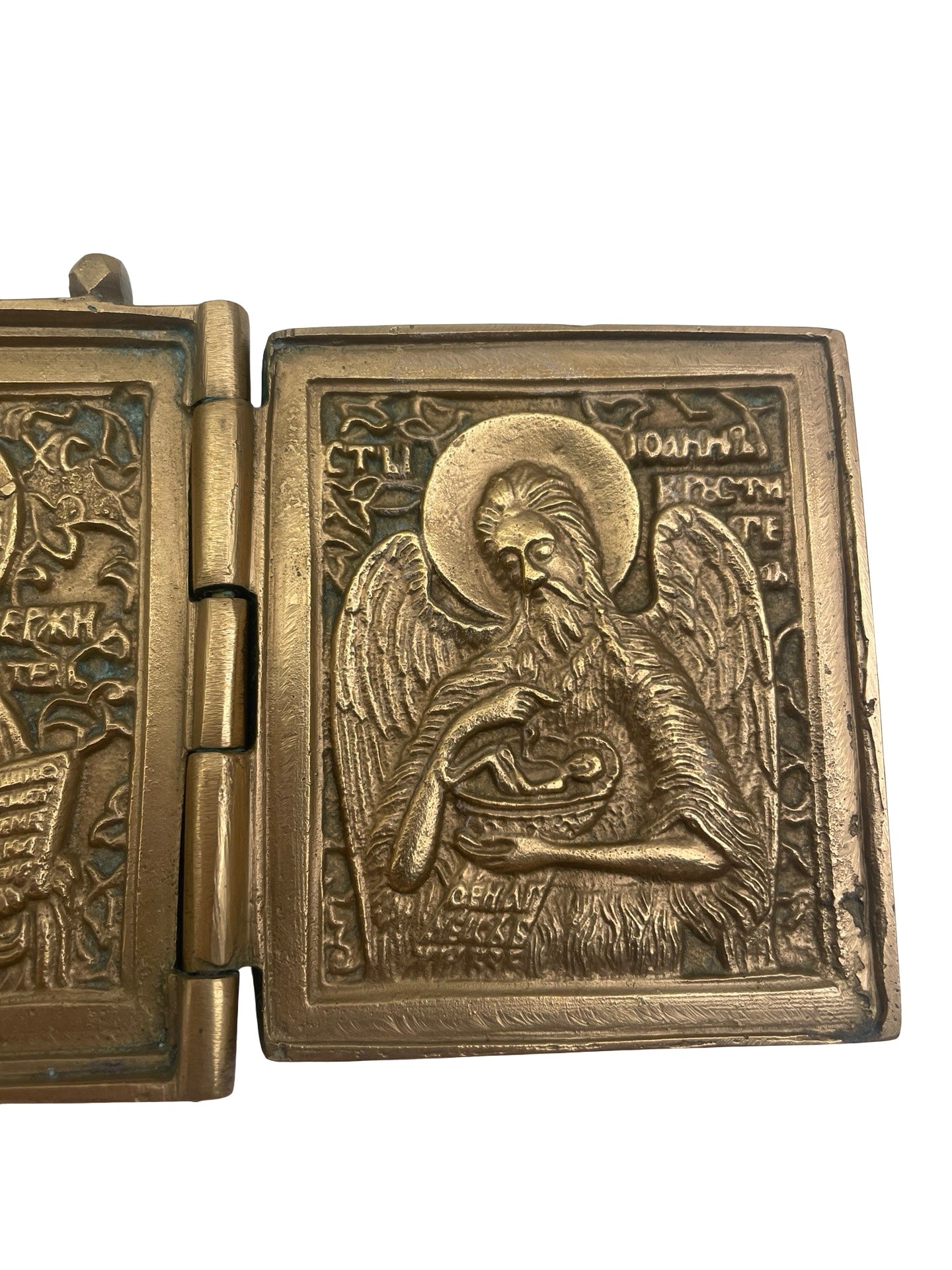 Icône russe triptyque de voyage en laiton moulé, représentant au centre le Christ Pantocrator, entouré de la Vierge et de Saint Jean-Baptiste, selon l’iconographie orthodoxe traditionnelle.
