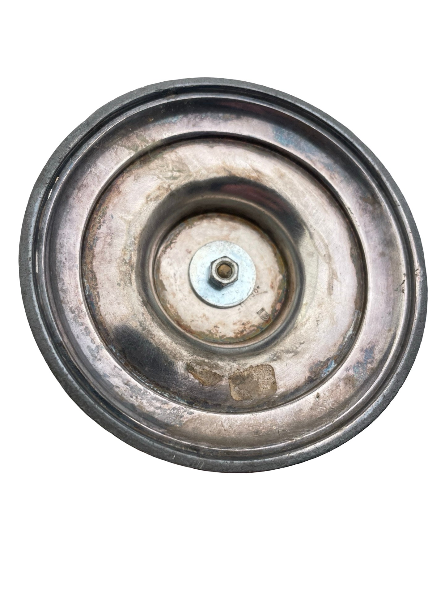 État : argenture manquante, traces d’oxydation, base légèrement déformée
