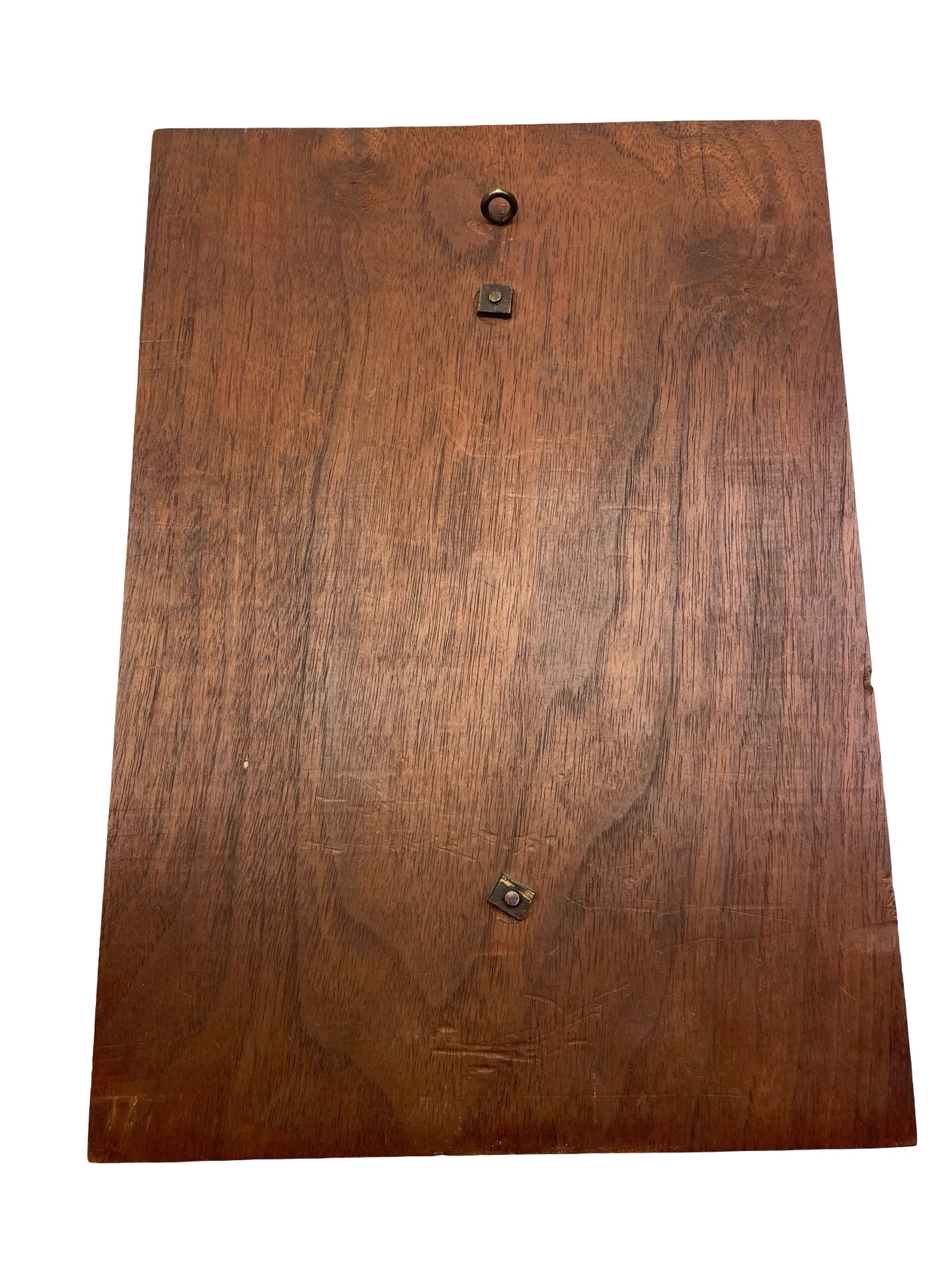 La plaque est montée sur un support en bois, formant un ensemble mural décoratif prêt à être accroché.